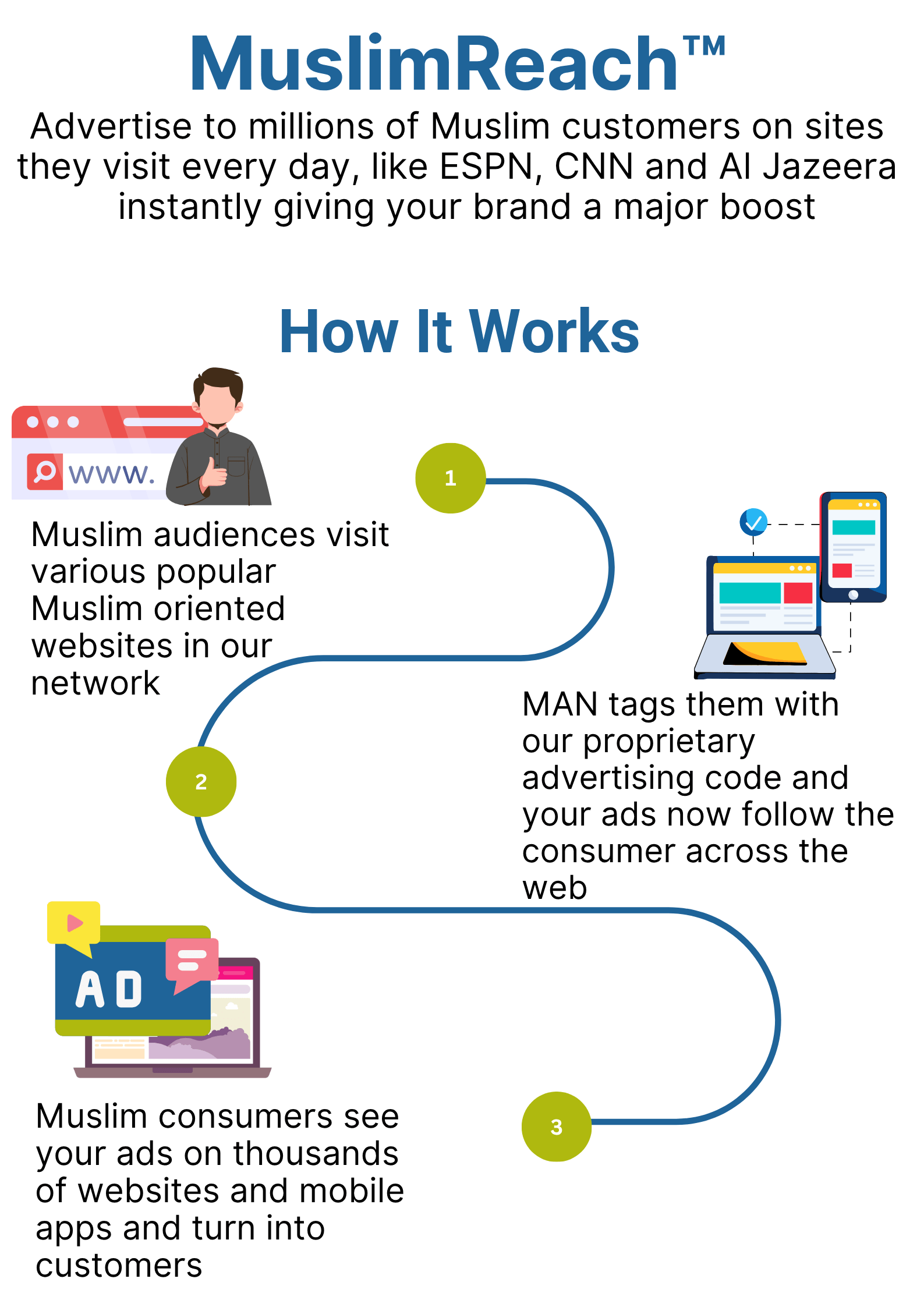Muslim Ad Network (MAN) gives advertisers direct access to a highly engaged and rapidly growing Muslim online audience. Through one powerful platform, your brand can reach over 250 million Muslim consumers every month across thousands of websites, social platforms, mobile apps, and more.